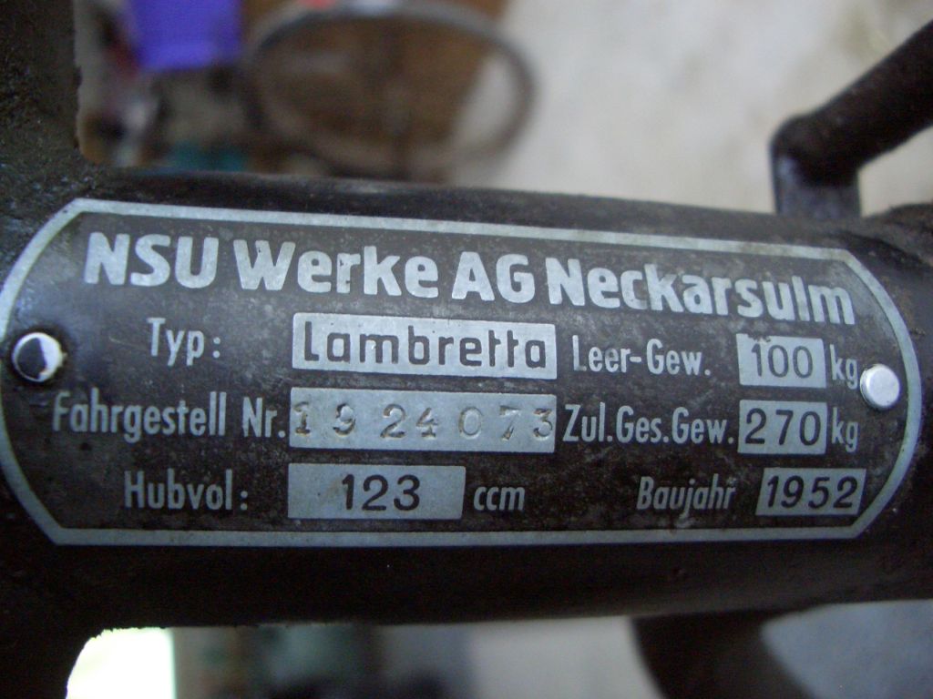 Modell: Lambretta Herstellerland: Deutschland Baujahr: 1952 Hubraum: 123 ccm Leistung: 4,5 bei 4500 n ps Höchstgechwindigkeit: 72 km/h Verbrauch: ca 3 ltr. l/100 km Eigengewicht: 100 kg Gesamtgewicht: 270 kg Fahrgestellnr.: 1 924 073 Motornr.: 924 153 Bereifung: 4.00 - 8 Farbe: grĂ¼n