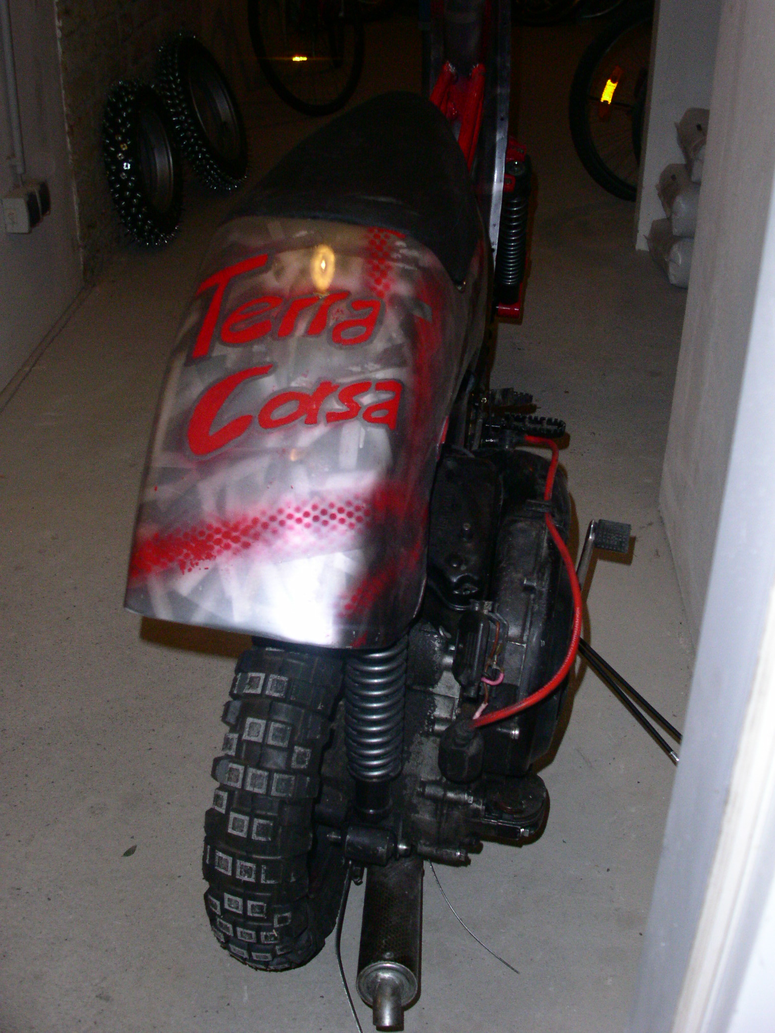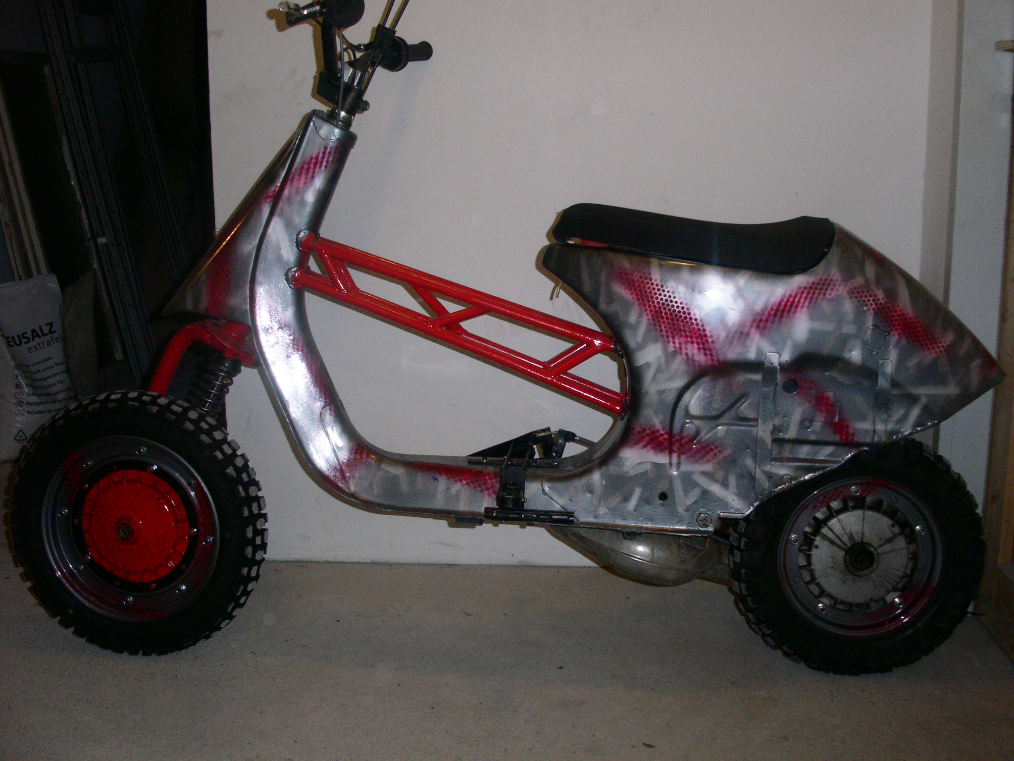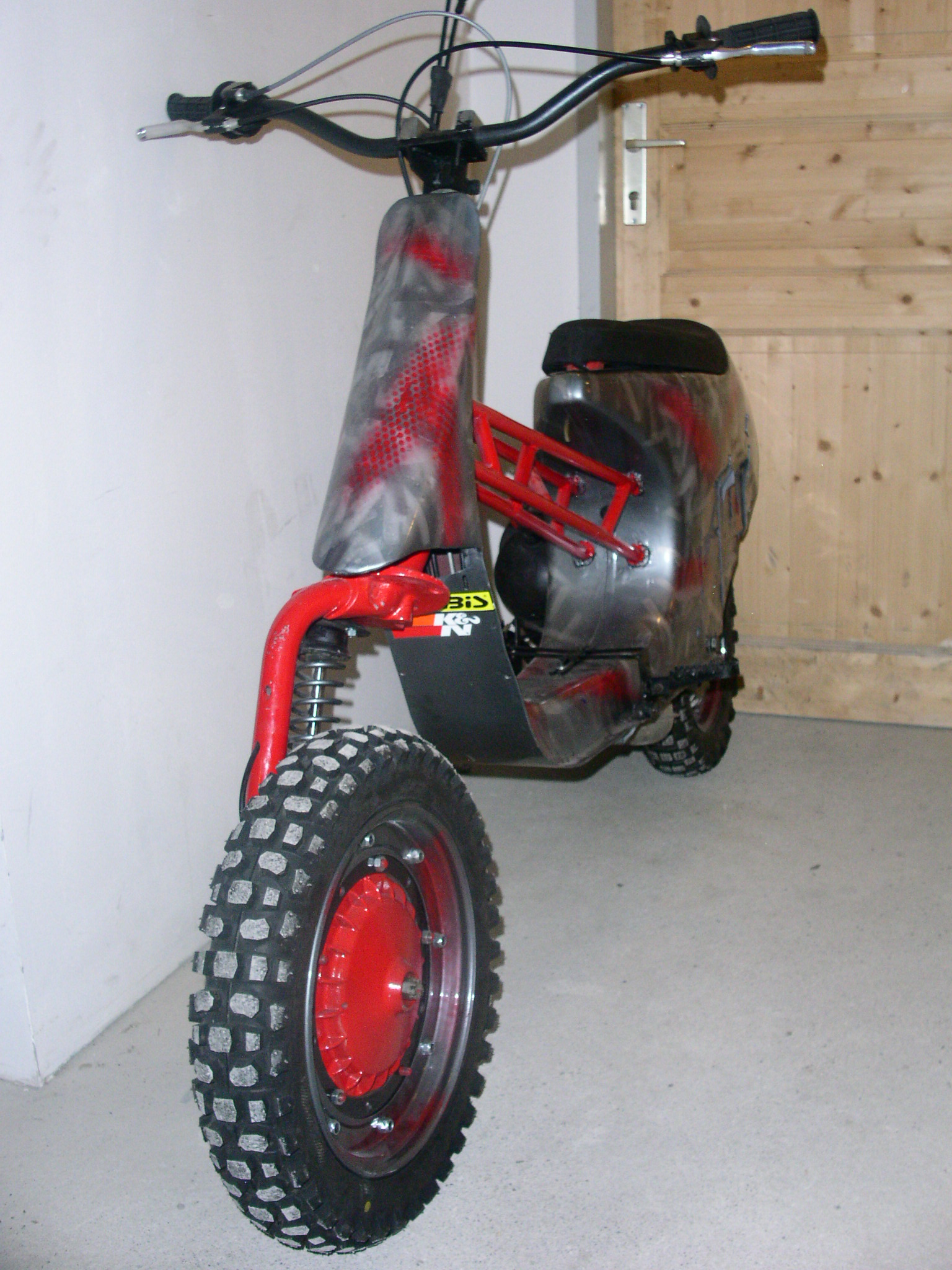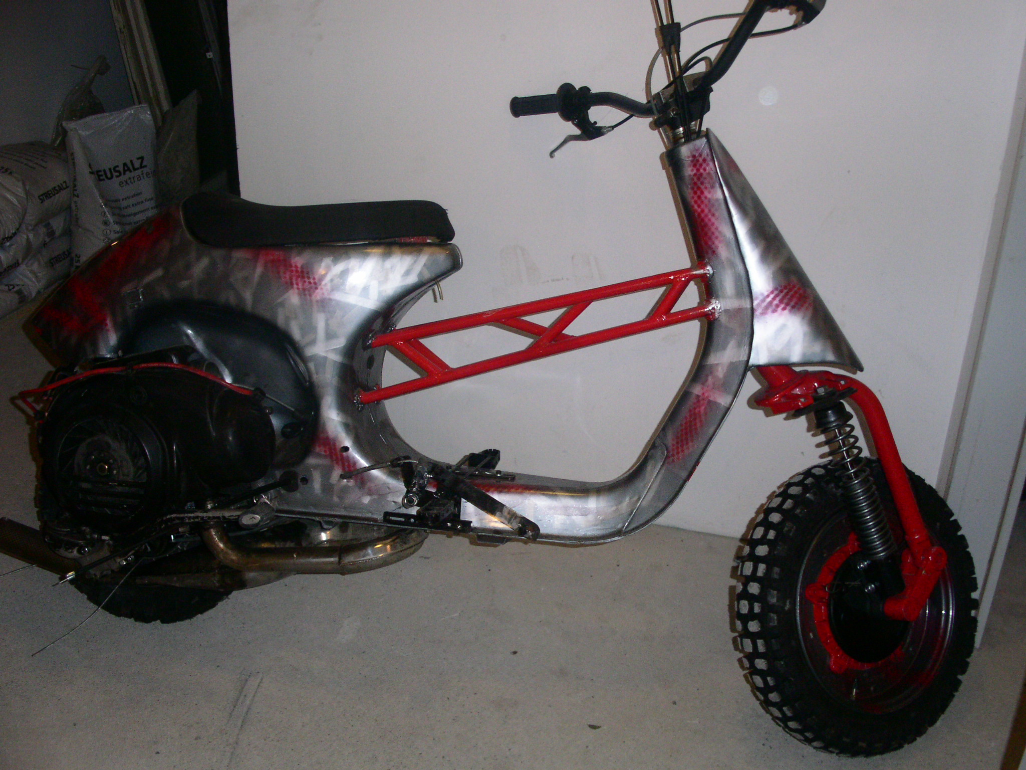 Terra Corsa - MX outfit PX Rahmen von einem "Umfaller". Beinschild cut. Nasenkorrektur, Heck aufgespritzt, Sitzbank-Eigenbau, Traverse Durchstieg - Wäscheständer Rohr, Motor wurde von der BB ausgeborgt FMP- inside, MX-Lenker, Fußrasten, Fußbremse, Drehgriffschaltung-Eigenbau z.Z. Iceracer für den 15. Jänner in Göstling. Ein starker Event von der Ybbsthaler-Rollerflotte. Spikes M5 Torband-handgespitzt incl. Krallenmutter - Version nieeee wieeeeder Vespa Italien