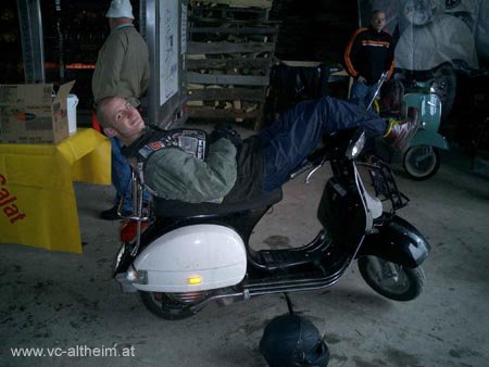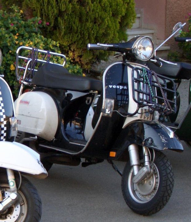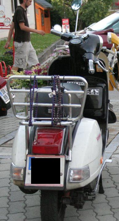 Nicht viele Besonderheiten, Schwarz-weiße Lackierung, Standard-Motor, Weiße Blinkergläser, H4-Scheinwerfer, Ancilotti-Sitzbank, Gepäckträger vorn und hinten, SIP Road Vespa Italien