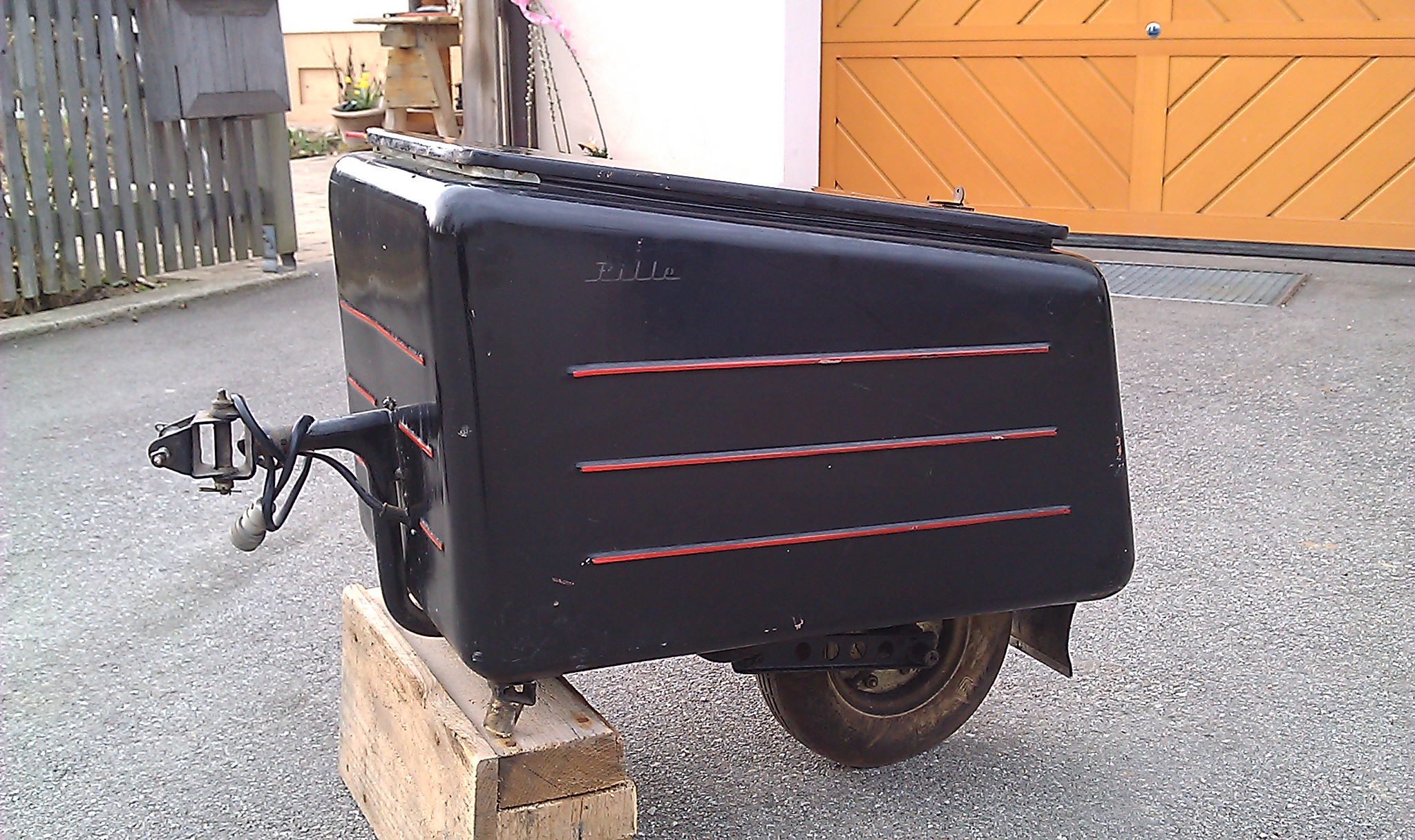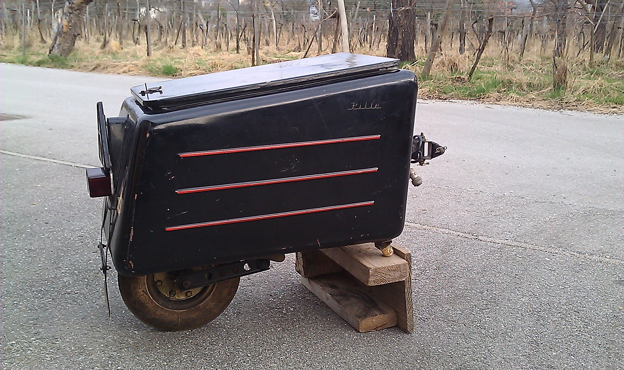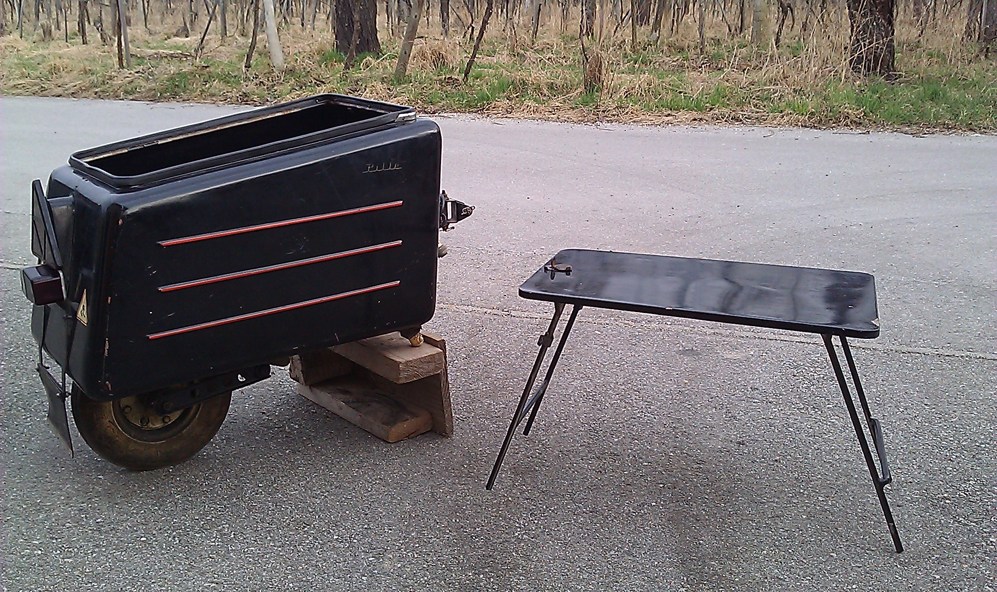 Im Deckel befindet sich ein Klapp Campingtisch. Pille Einspuranhänger Ungarn