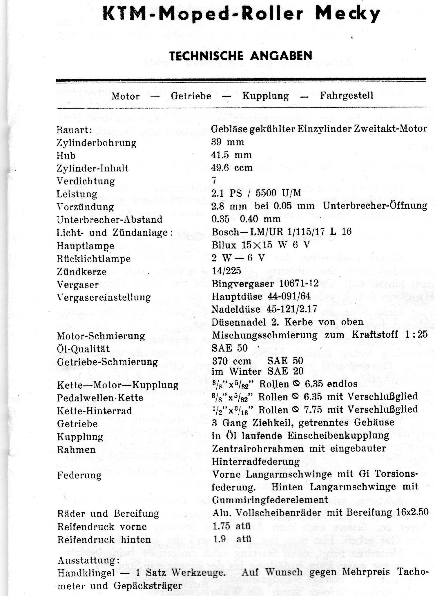 Gebläsegekühlter 2-taktmotor (Apfelbeck), 3-Ganggetriebe mit Drehgriffschaltung, Tankinhalt 7,5 Liter, Leichtmetall-Vollscheibenräder (!) mit Vollnabenbremsen, Steigfähigkeit ohne Mittreten 28%. Preis NEU (damals) 3.880,-- Schilling. Endlich! Nach langen Erkundigungen, Behördenwegen und Gutachten habe ich es geschafft: Am 25.07.2011 erhielt ich eine EINZELGENEHMIGUNG für das MECKY! ...und seit 2 Monaten ist es ANGEMELDET! Ein tolles Gefühl, es endlich geschafft zu haben - vielen Dank an alle, die mich dabei unterstützt haben - allen voran Martin und Peter! KTM Österreich