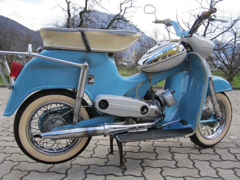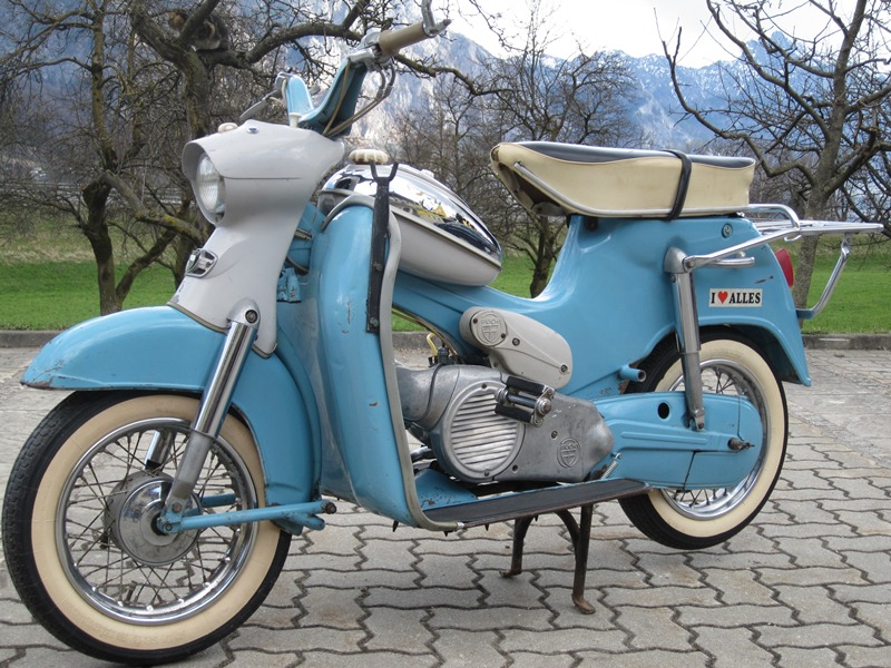 Modell: DS50 Herstellerland: Österreich Baujahr: 1959 Hubraum: 48,8 ccm Leistung: 2,1 ps Höchstgechwindigkeit: 40 km/h Gesamtgewicht: 220 kg Fahrgestellnr.: 7535452 Motornr.: 7535452 Vorbesitzer: 1 Bereifung: 3 x 12 Farbe: blau