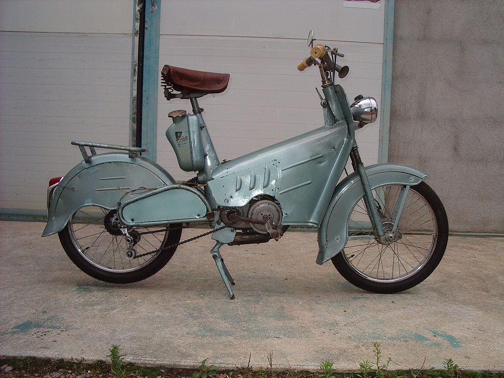 Anmerkungen: cyclo-scoot, but with full drum brakes ! front suspension ! , rear cantilever suspension ! and pedals to help the " le poulain" engine !