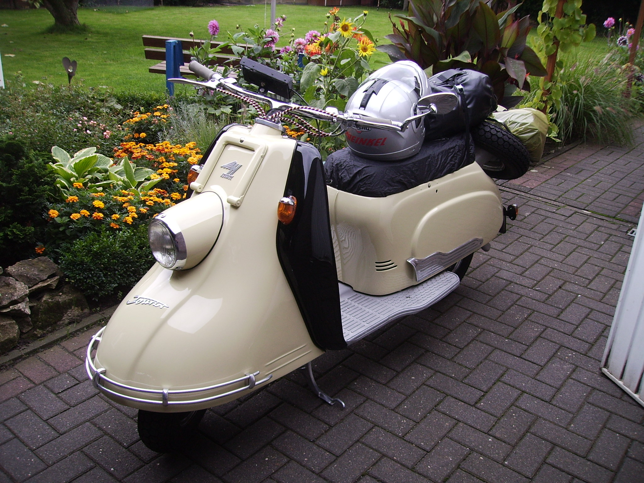 Diesen Roller habe ich 2009 neu aufgebaut. Er hatte seit 1960 trocken gestanden und war in einem guten Zustand. Eigentlich habe ich nur den Motor überholt und die Karosserie außen neu in der ursprünglichen Farbe lackiert. Rahmen Bowdenzüge Kabelbaum und Chromteile waren in so einem guten Zustand dass außer reinigen nichts gemacht werden musste. Das Foto zeigt meinen Roller 2013 kurz vor der Abfahrt zum Loreley Heinkel Treffen ![]() Heinkel Deutschland
