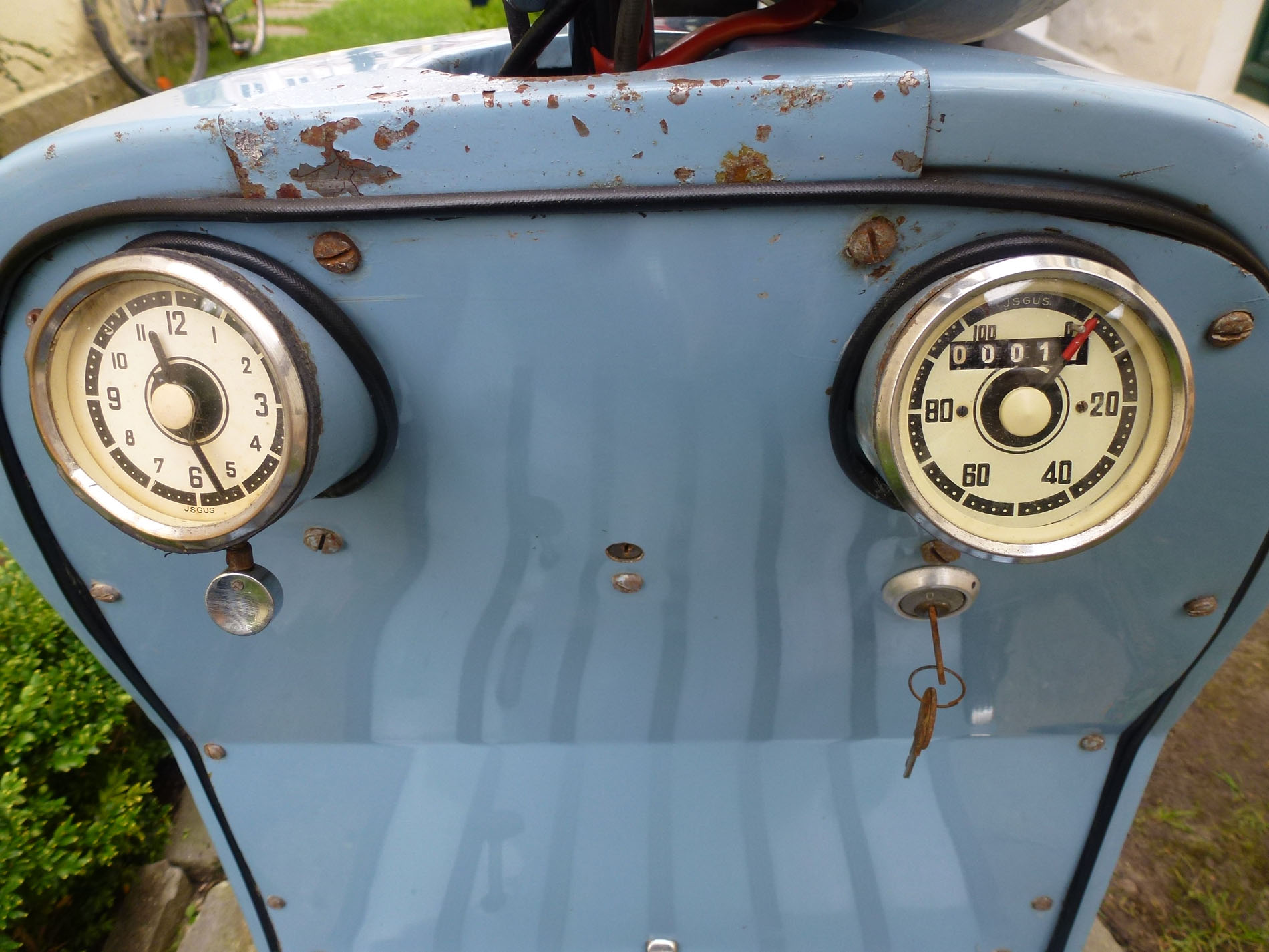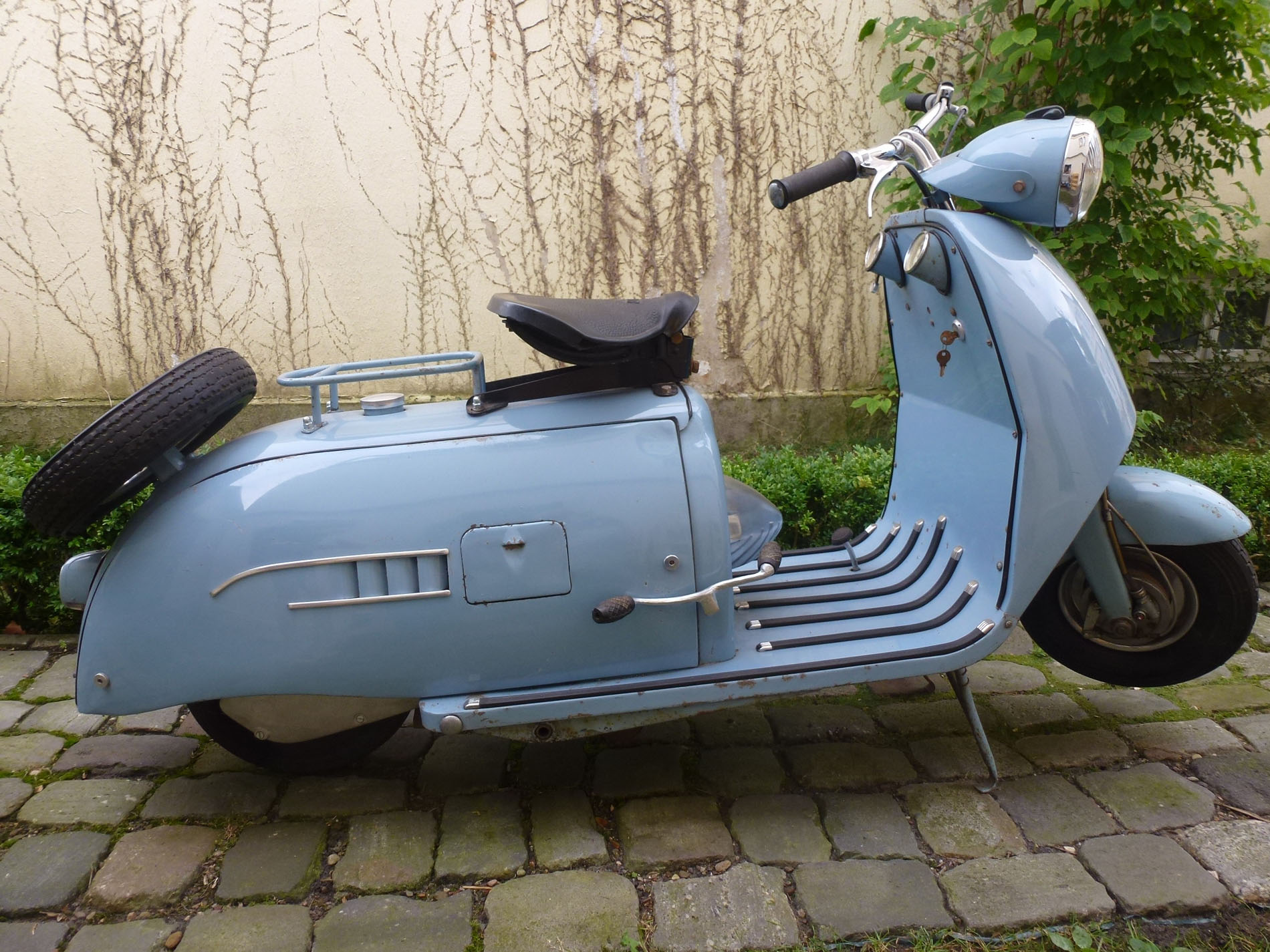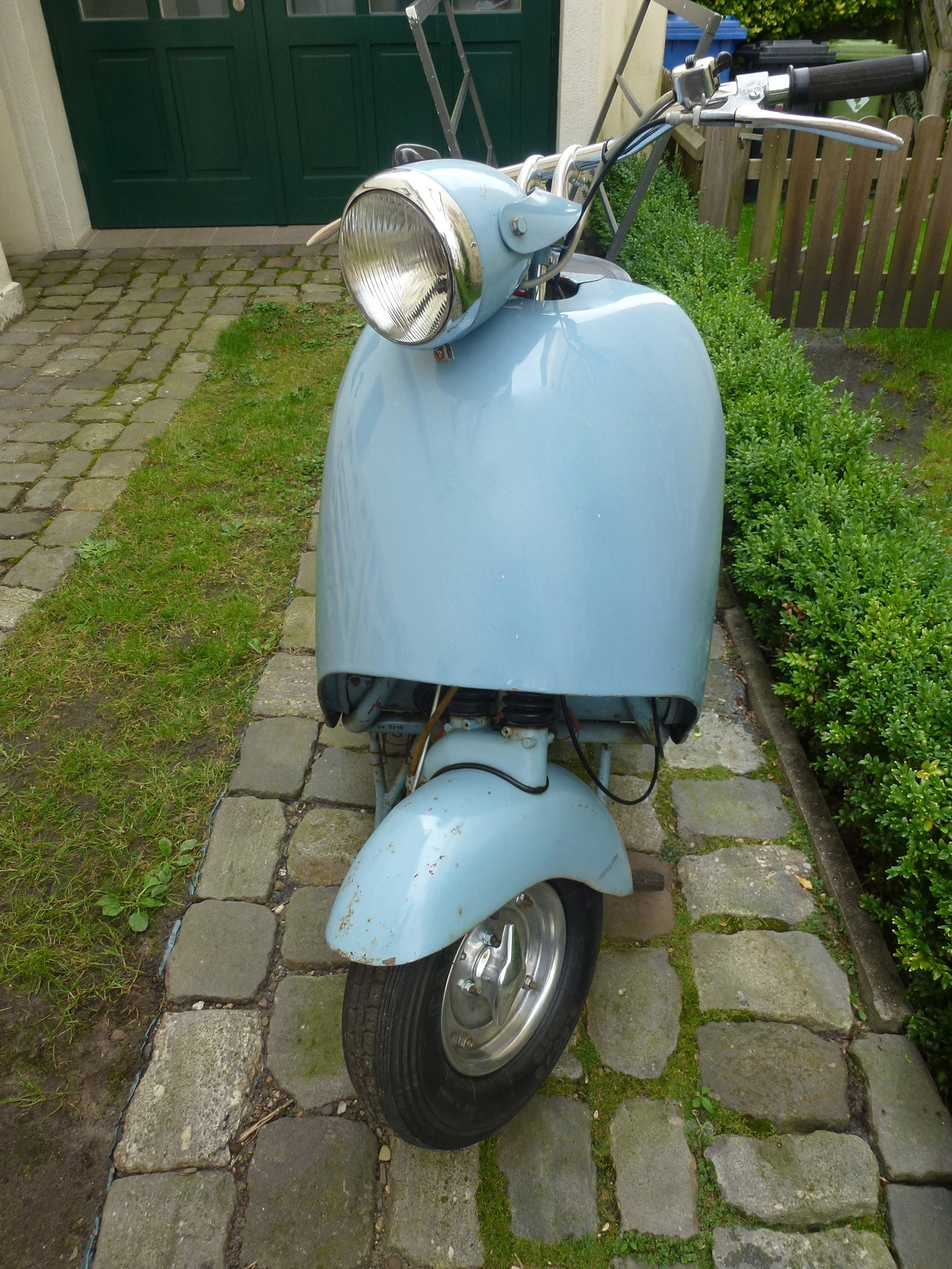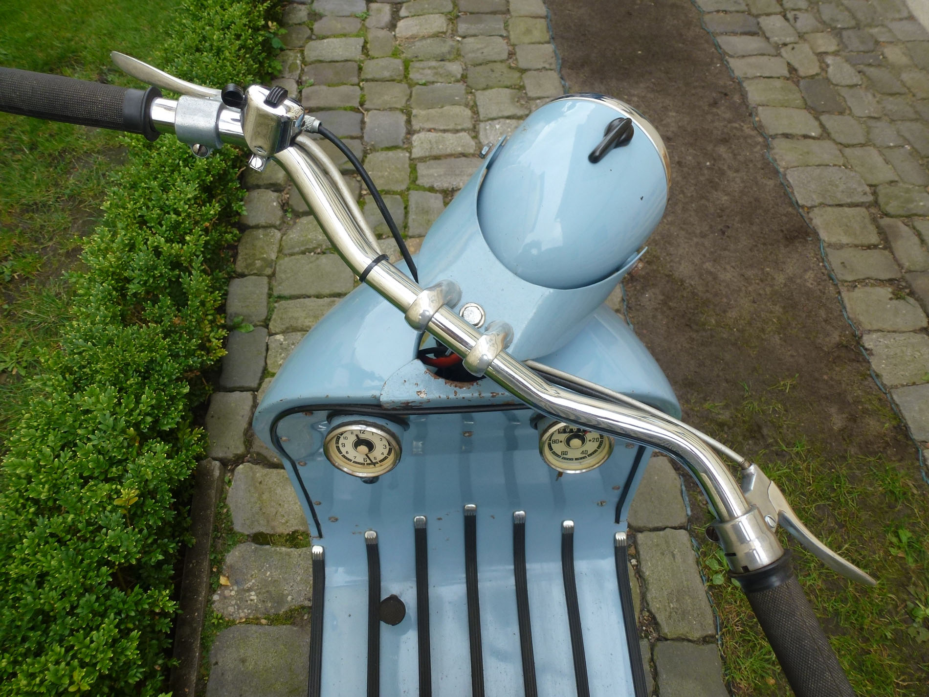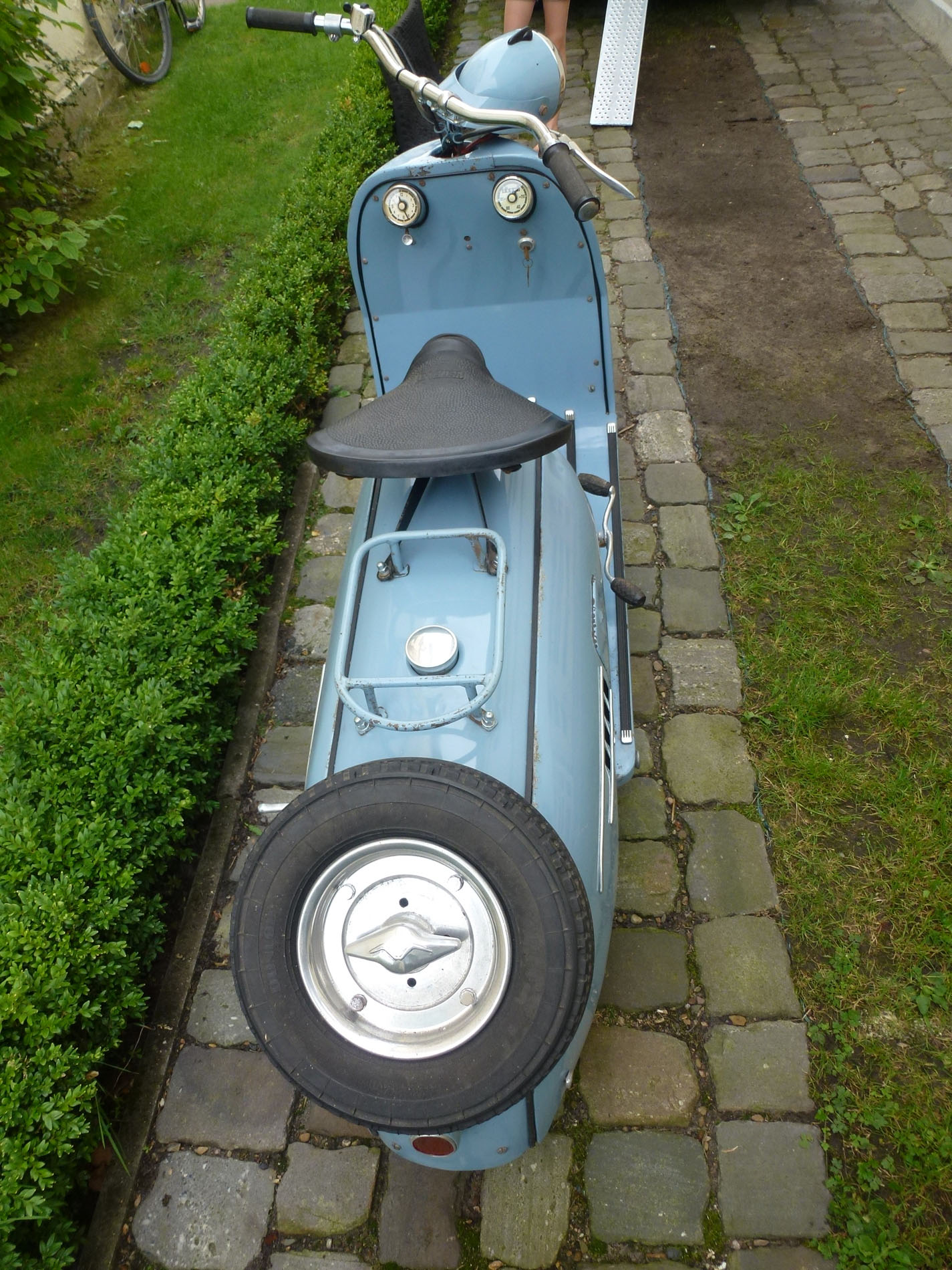 Walba Tourist in der Standard Ausführung. Unter dem blauen Lack ist er beige. Wahrscheinlich wurde der Roller nie verkauft. Lag es am Roller oder an der Farbe? Das Fahrzeug hat noch keine 20 km gelaufen. Suche noch den Walba und Tourist Schriftzug. Hat noch jemand eine Bedienungsanleitung, Ersatzteilliste oder alte Werbe und Verkaufsprospekte. Vielleicht könnt Ihr ja auch Unterlagen zum kopieren ausleihen? Ich erstelle gerade ein Register über den Walba und Faka Roller. Bitte meldet Euch bei mir um viele Daten und Adressen aufnehmen zu können. Alle Besitzer dieser sehr seltenen Roller haben dann die Möglichkeit sich untereinander austauschen zu können. Ein paar konnte ich bereits eintragen. Sehr gute Erfahrungen habe ich schon mit anderen Registern gemacht ( Triumph TWN, Victoria Peggy/Swing, Progress Roller ). Daten werden nur unter Faka und Walba Besitzer ausgetauscht. Bitte helft mit, um einen aktuellen Bestand zu ermitteln. Vielen Dank und Grüße aus Oldenburg. andreasklose.oldenburg@t-online.de Tel. 01522 8050996 ![]() Walba Deutschland