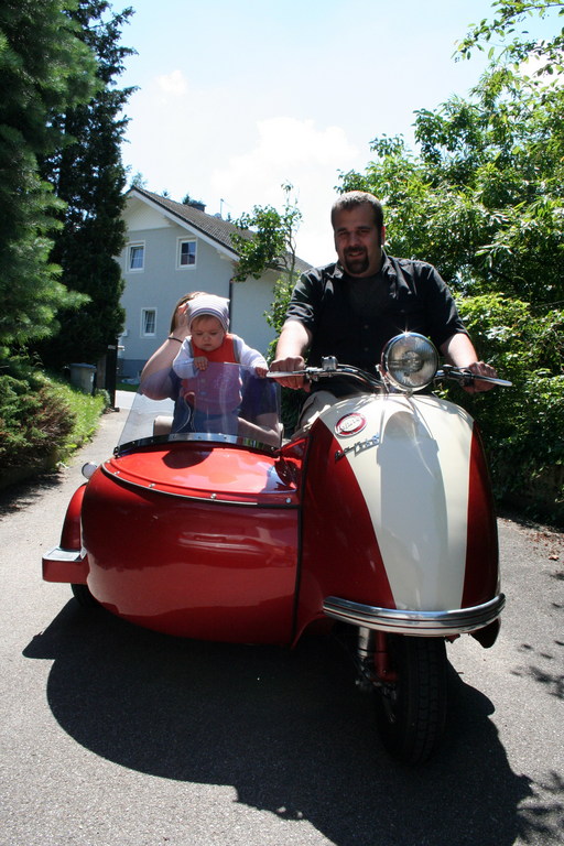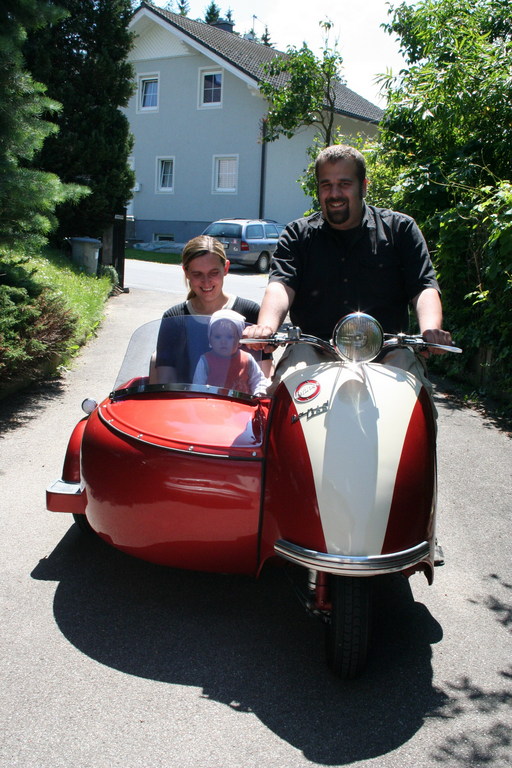 Modell: Rapid 200 mit Beiboot Herstellerland: Österreich Baujahr: 1956 Hubraum: 200 ccm Leistung: 9,5 ps Höchstgechwindigkeit: 75-80 km/h Eigengewicht: 175 kg Fahrgestellnr.: 16/1048 Vorbesitzer: 2 Bereifung: 4.00-8 Farbe: nicht original,