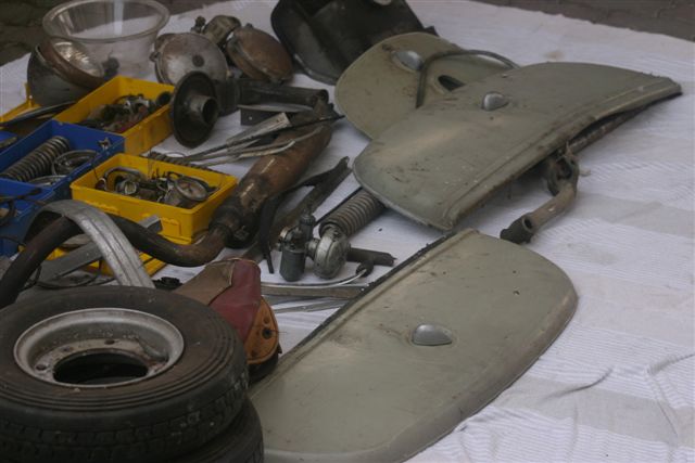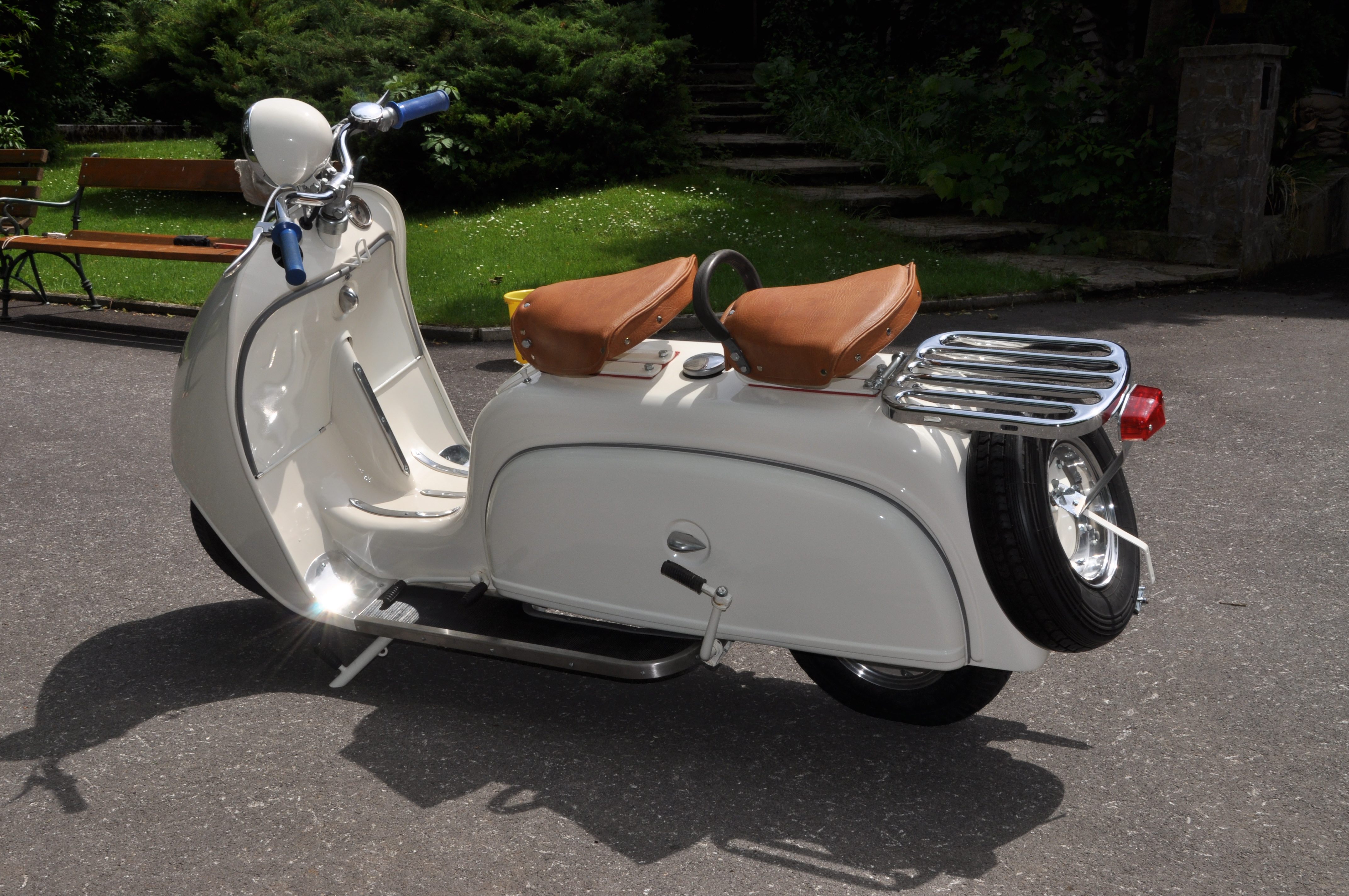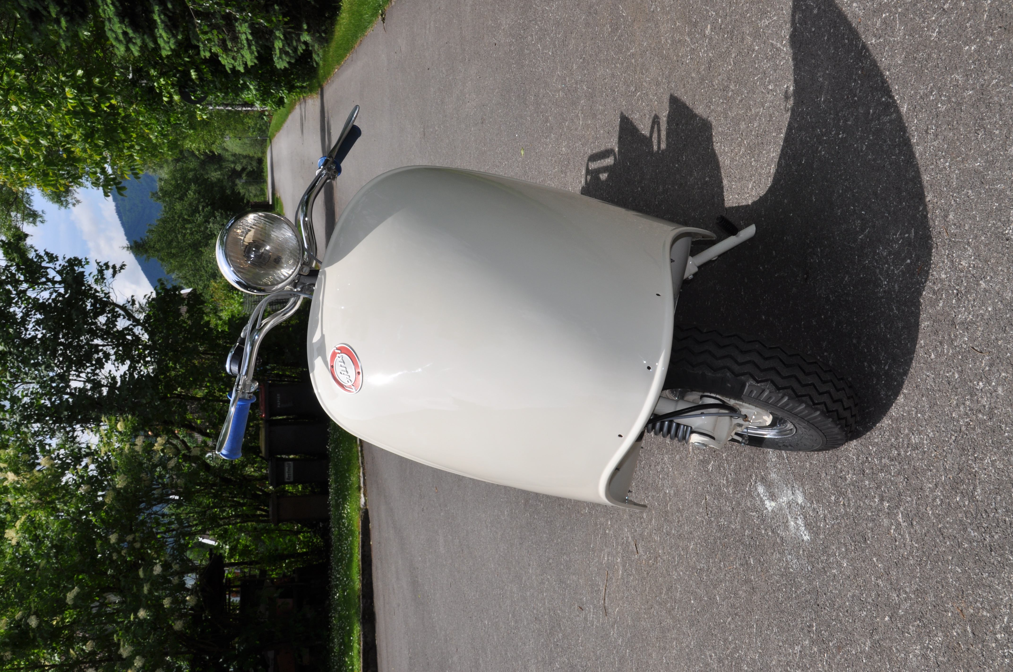 Jetzt noch Räder montieren, Elektrik fertig machen, Motoröl einfüllen und dann kann der Frühling kommen. Besonderheit: Paketträger in Stahlblechausführung (und nicht in Alu wie üblich). Vorher rot lackiert, jetzt verchromt. 2.6.2009: Bis auf ein paar Kleinteile ist der Roller fertig, jetzt müßte nur noch der Motor anspringen und der Gang raus ... 4.4.2010: sodala endlich läuft er. und fährt sich recht nett. jetzt nur noch ein paar Kleinigkeiten (stoßstange, trittbrettverbreitungen, hupe ...) 15. August 2011: sodala, Halterung fuer das Tupfergestaenge ist fertig, mal sehen ob es sich besser bewaehrt als das einfache Anschrauben am Vergaser. August 2014: Pickerl hat er bekommen :) und die Anmeldung war problemlos, da Typenschein vorhanden. November 2014: Tank wurde versiegelt und Motor wird überholt über den Winter. Dezember 2014: Motorüberholung: Kolben gerissen, Zylinden muss neu geschliffen werden und die Kurbelwelle muss auch überholt werden. kein Wunder, dass der Motor nicht ordentlich gelaufen ist ... August 2015: Motor endlich fertig, eingebaut und fährt - brummm