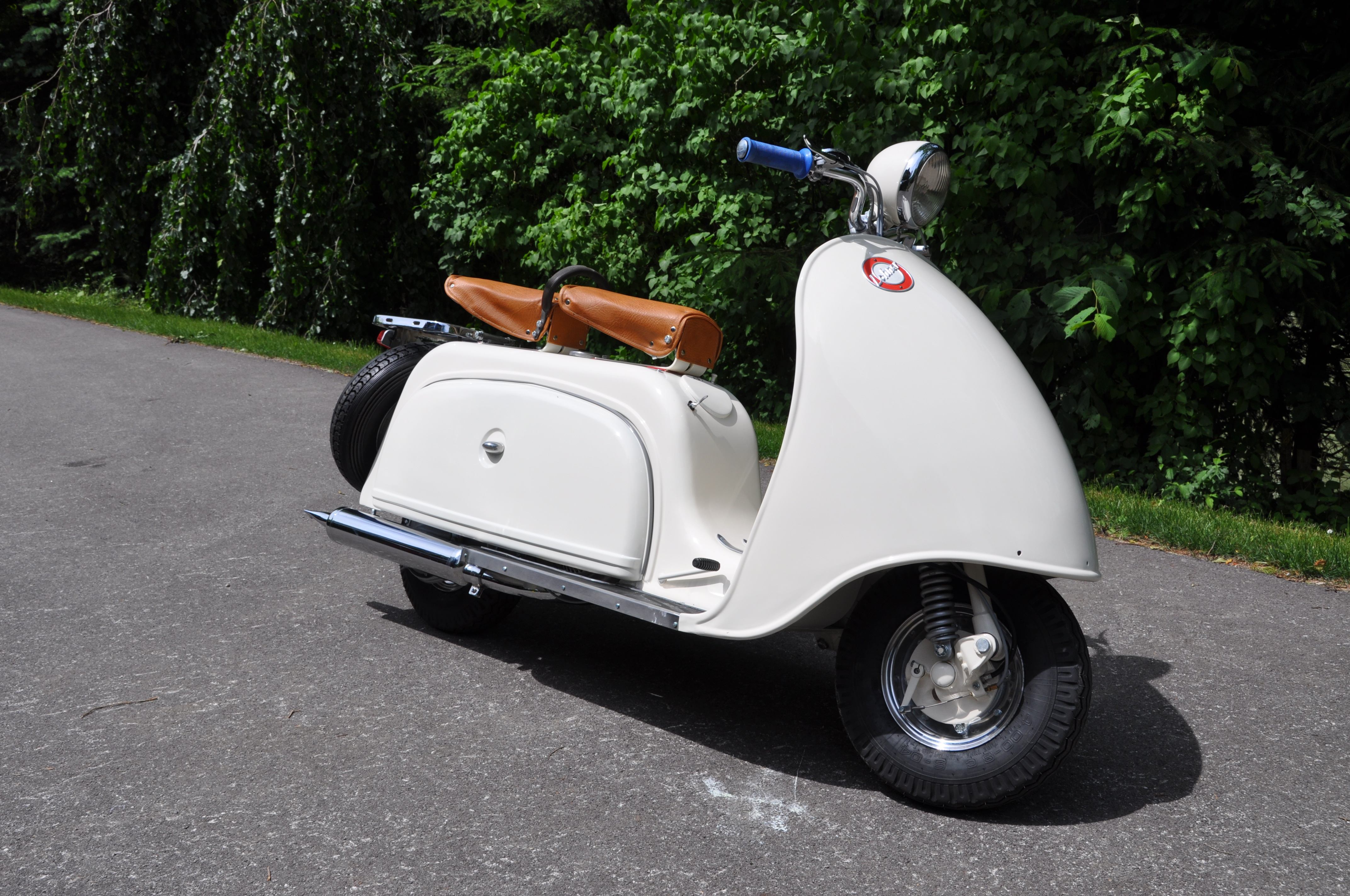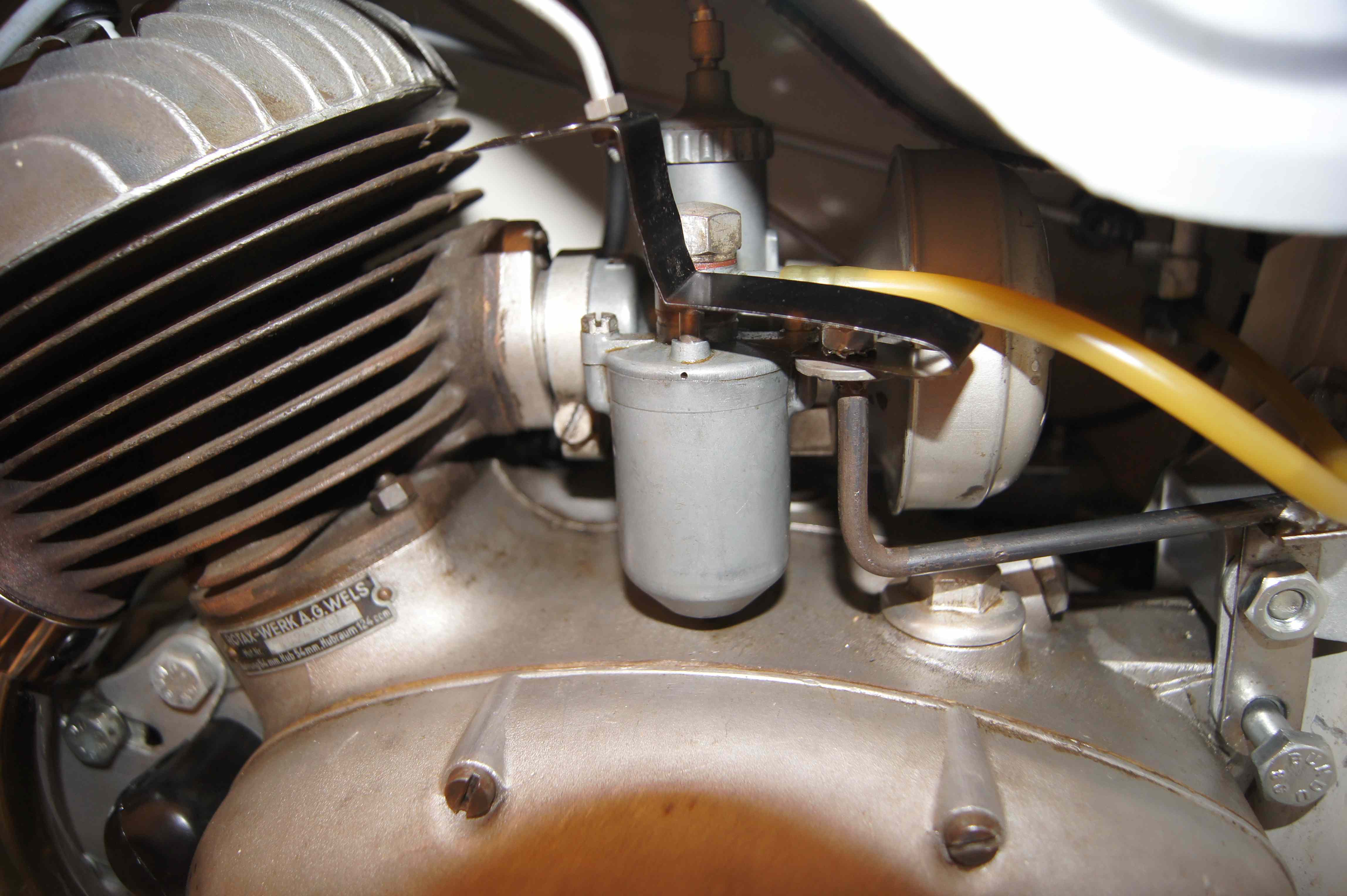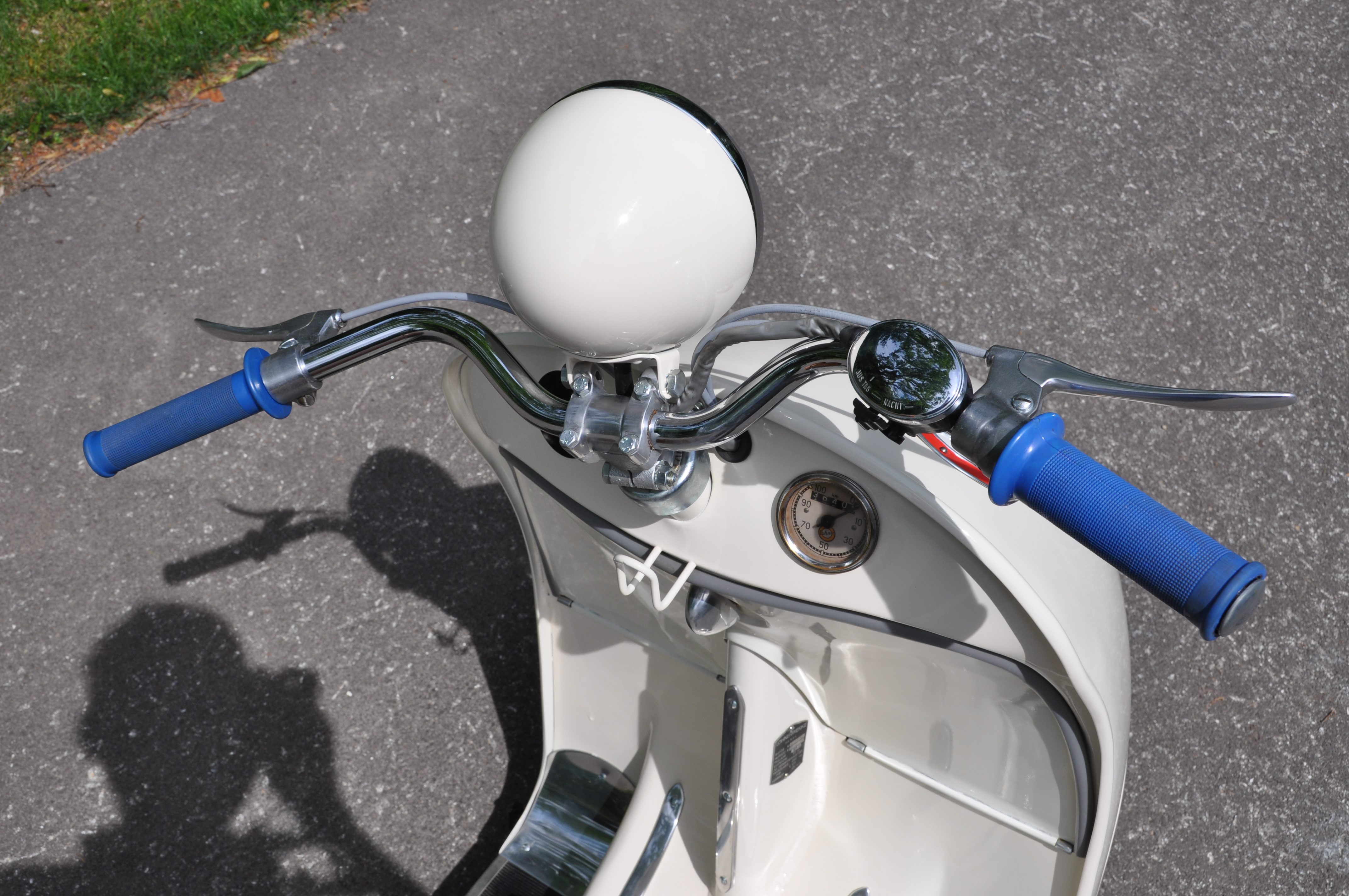 Jetzt noch Räder montieren, Elektrik fertig machen, Motoröl einfüllen und dann kann der Frühling kommen. Besonderheit: Paketträger in Stahlblechausführung (und nicht in Alu wie üblich). Vorher rot lackiert, jetzt verchromt. 2.6.2009: Bis auf ein paar Kleinteile ist der Roller fertig, jetzt müßte nur noch der Motor anspringen und der Gang raus ... 4.4.2010: sodala endlich läuft er. und fährt sich recht nett. jetzt nur noch ein paar Kleinigkeiten (stoßstange, trittbrettverbreitungen, hupe ...) 15. August 2011: sodala, Halterung fuer das Tupfergestaenge ist fertig, mal sehen ob es sich besser bewaehrt als das einfache Anschrauben am Vergaser. August 2014: Pickerl hat er bekommen :) und die Anmeldung war problemlos, da Typenschein vorhanden. November 2014: Tank wurde versiegelt und Motor wird überholt über den Winter. Dezember 2014: Motorüberholung: Kolben gerissen, Zylinden muss neu geschliffen werden und die Kurbelwelle muss auch überholt werden. kein Wunder, dass der Motor nicht ordentlich gelaufen ist ... August 2015: Motor endlich fertig, eingebaut und fährt - brummm