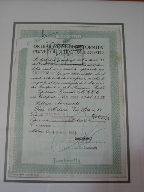 Nach eineinhalb Jahren telefonischen Verhandeln mit dem Verkäufer aus Tirol (ehemaliger Pole) habe ich den Roller in September 2005 ohne ihn jemals in natura gesehen zu haben gekauft. Habe nur Fotos bekommen und die Beschreibung per Telefon. Geliefert wurde per Spedtion. Es gibt halt noch ehrlich Leute.) Roller ist fahrbereit und in noch brauchbaren O-Zustand. Suche jedoch Seitendeckeln in schönen Originallack da meine sehr rostig sind und vom Lack her sehr stumpf! Worüber ich mich besonders freue ist das auch das Echtheitszertifikat aus dem Lambrettawerk mit Rahmenummer, Datum und Unterschrift dabei ist :) Siehe auch Foto. Es gibt nicht mehr viele roller wo das dabei ist. 30-05-2009: Suche Lichtschalter original NOS und Rüliglas NOS aber auch andere NOS Teile für TV3. Wer was hat bitte melden!!