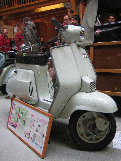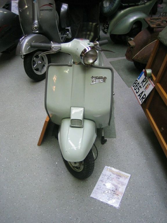Gekauft 2001 am Oldtimermarkt in Graz Kalsdorf. Alle Besucher hatten in nur belächelt und gemeint so einen schrott hat ducati auch mal gebaut! Sehr schöner Originalzustand. Fahrbereit, Motor wurde übern Wintern nur neu abgedichtet. Kilometerstand 890!! War vermutlich noch nie zugelassen. Leider keine Papiere vorhanden. Fotos stammen von www.alteroller.de von der Customshow Ried 2006 wo ich den Roller ausgestellt hatte. Zur Zeit verbringt er den Winter als Deko in meinen Haus. Fotos folgen. Such NOS Griffe!!! Orginalprospekte, Schlüsselanhänger, Ersatzteilliste, Lichtschalter NOS und Refektor in NOS vorhanden. Ducati Italien