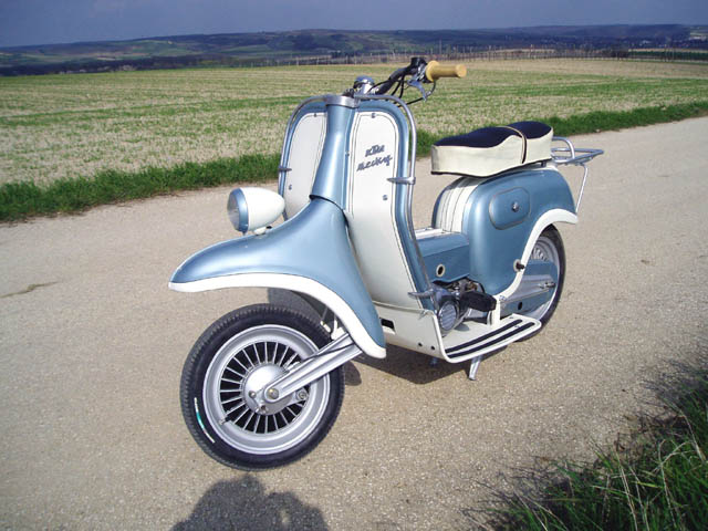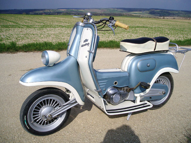 Modell: Mecky Herstellerland: Österreich Baujahr: 1957 Hubraum: 49 ccm Leistung: 2,1 ps Höchstgechwindigkeit: ca. 40 km/h Verbrauch: ca. 3 l/100 km Eigengewicht: 90 kg kg Farbe: weiß/blau metallic (original)
