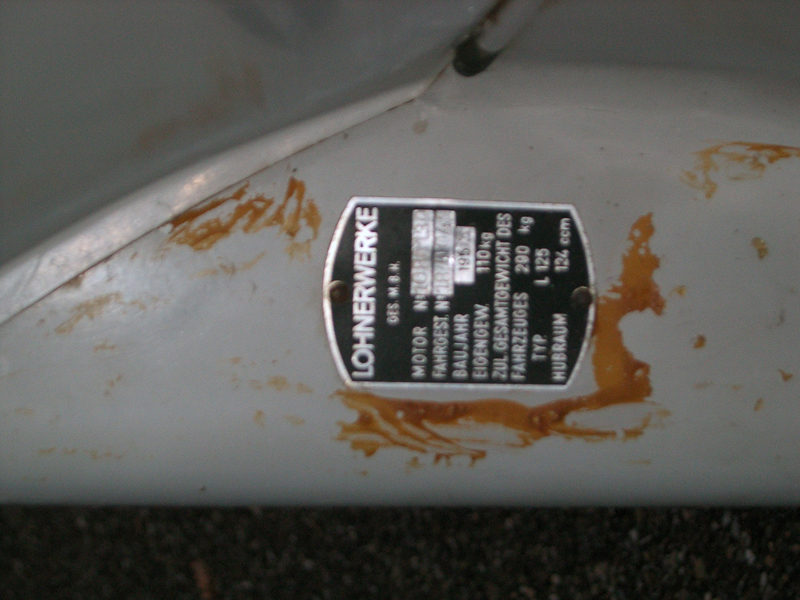 Interessantes Detail am Rande! Roller ist eigentlich ein waschechter 150er, der aber werksseitig als 125er genehmigt wurde. Auch mit dabei ist der Schriftzug vorne - statt L150 eben L125. Auch das Typenschild ist ein 125er, aber eben auch mit der 150er Nummer versehen! Wie gesagt, definitiv original, da die Einzelgenehmigung von 1963 von den Lohnerwerken durchgeführt wurde. ![]() Lohner Österreich