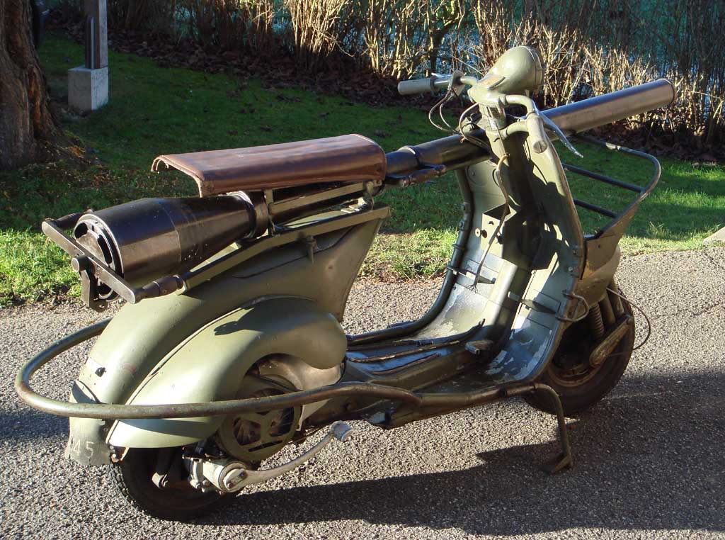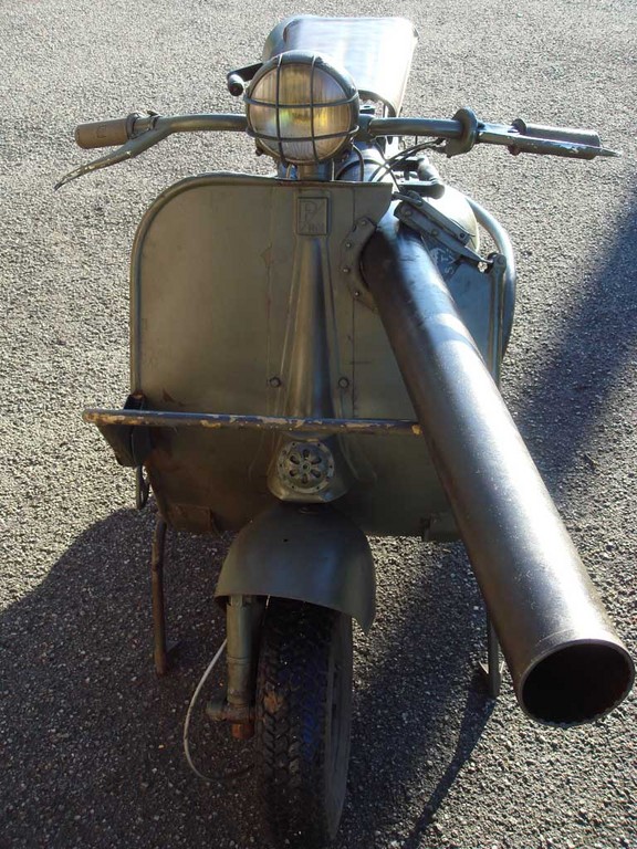 Diese Vespa wurde in Frankreich von der Fa. ACMA, für das Militär produziert. Genau diese Vespa wurde einige male mit dem Fallschirm abgeworfen, davon zeugen die kleinen Schirmchen auf der linken Seitenback. Kanone ist nicht mehr Einsatzfähig. Die gehört dem Karl und mir gemeinsam. Vespa Italien