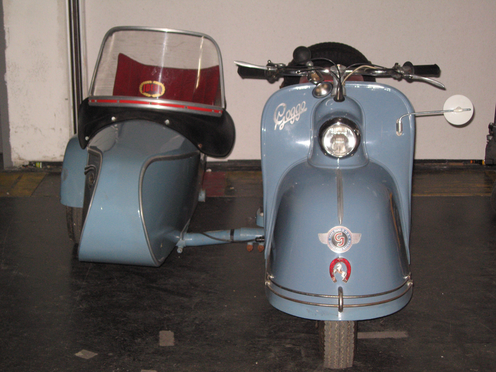 Modell: Goggo mit Beiwagen Herstellerland: Deutschland Baujahr: 1953 Hubraum: 198 ccm Leistung: 7 ps Höchstgechwindigkeit: ausreichend km/h Eigengewicht: 170 kg Gesamtgewicht: 400 kg Bereifung: 4.00-8 Farbe: blau