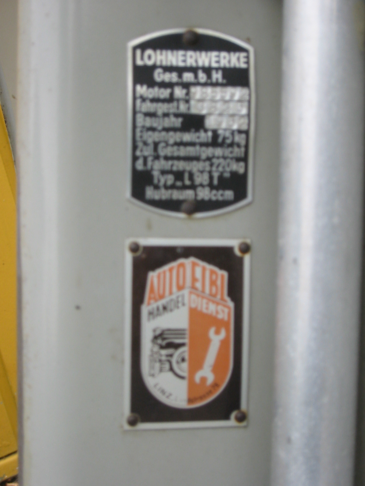 Modell: L98 T Herstellerland: Österreich Baujahr: 1952 Hubraum: 98 ccm Leistung: 2,25 ps Höchstgechwindigkeit: 60 km/h Fahrgestellnr.: 3825 Vorbesitzer: 2 Bereifung: 4.00-8 Farbe: stahlgrau